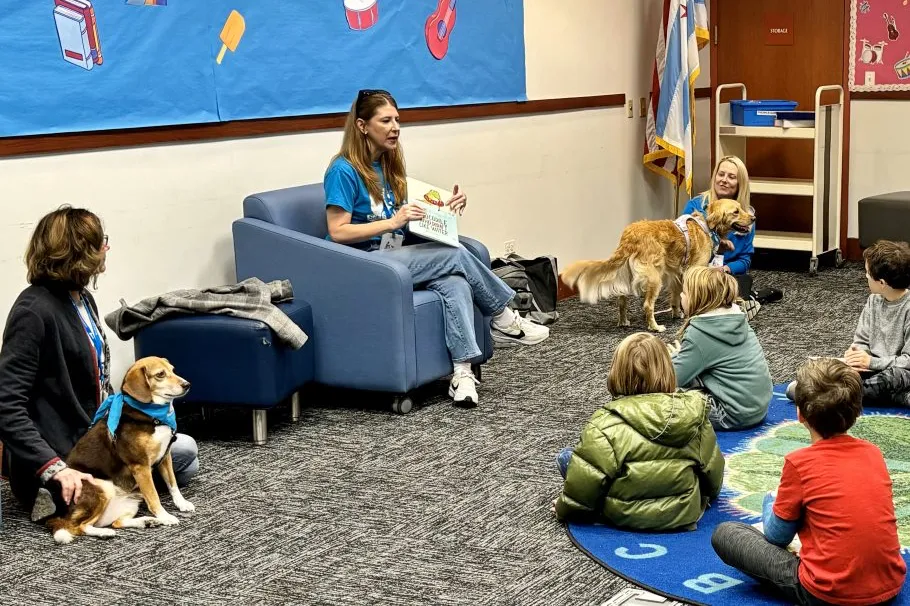 Three adults and two dogs are interacting with a group of children in a classroom setting; one adult reads from a book while the children listen.